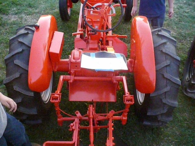 He said it took 3 years on the WD. The WD has 3 gears and has a Tecumseh engine disguised under there. The back wheel centers came off of a garden tractor, he made the outer wheels to have the adjust bars on them. The hydraulic do go up and down. Lots of welding and grinding he said. The fenders he made a wood block mold. Cut cardboard to fit it..then took the pieces of cardboard and put them on the sheet metal...then he cut out the fenders and welded them together and ground the welds. YOu could never tell by looking that the fenders were welded. He has another one at home he is working on. The WD is gear driven rear end the WC is a chain drive he said. He has never tried the plow and said he probably never will. The clutch is weak on the WD he said. Just amazing work. Thousands of hours I imagine.