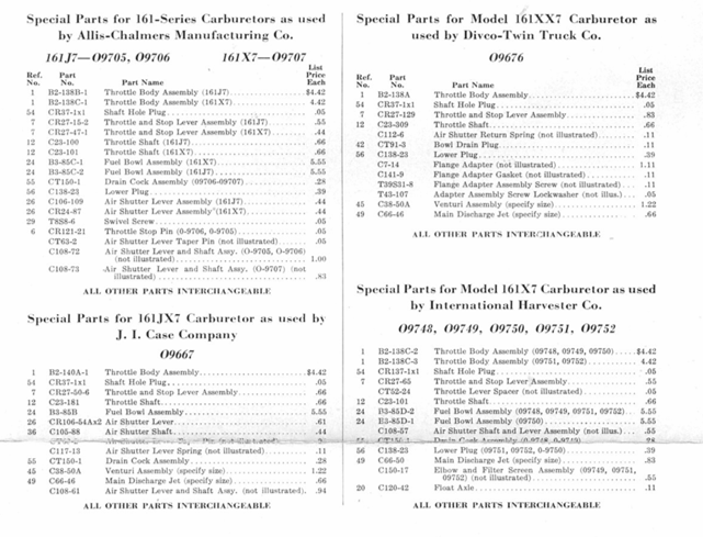 Here's everything AGCO has listed: B/IB/ C tractor - Zenith 70206989 CARBURETOR (#0-8561) (Use 70216937) 70208027 CARBURETOR (#0-8691) (Use 70216937) 70211456 CARBURETOR (#0-9636) (Use 70216937) 70211457 CARBURETOR (#0-9635) (Use 70216937) 70211954 CARBURETOR (#0-9804) (Use 70212844) 70211955 CARBURETOR (#0-0805) (Use 70212844) 70212844 CARBURETOR (#0-9706, 0-10697) 70212845 CARBURETOR (#0-9705,0-10698) (Use 70212844) 70216937 CARBURETOR (S-864) (Use 70224641) 70218487 CARBURETOR (#0-10698) (Use 70224641) 70224640 CARBURETOR (#0-10903) (Use 70224641) 70224641 CARBURETOR (#0-10902) -------------------- MS 70222090 * CARBURETOR ASY. (TSX-305) ** CARBURETOR ASY. (TSX-154) (Use 70222090) ------------------------ CA Zenith NOTE: Qty. shown are for both Carburetor No. 70225621 & 70225622 unless otherwise noted. 70225622 CARBURETOR (w/drain cock) (Outline No. O-1142) (Use to replace gasoline carburetor 70225621 w/o drain cock, Outline No. O-11141) (Don't use on Carburetor No. 70225621) ----------------------- MS 70225679 CARBURETOR ASY. (TSX-486) (Use 70251516) Edited by dfwallis - 19 hours 27 minutes ago at 9:13pm |