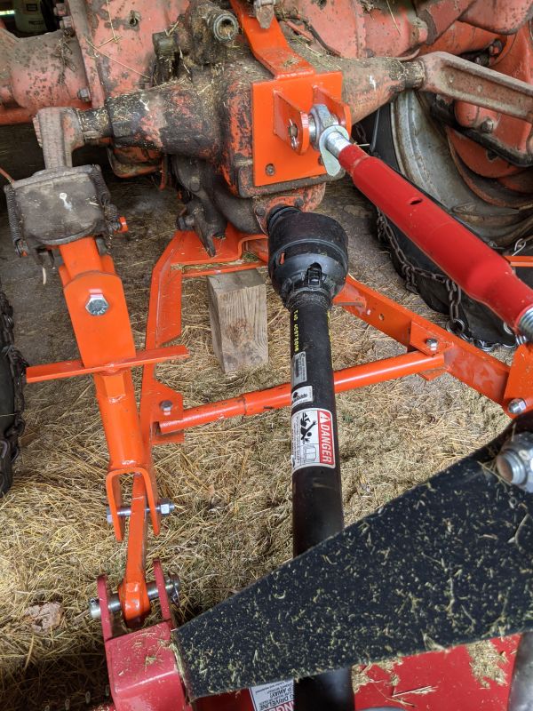 I recently purchased a new 3 point kit for my D17 and have started running a Landpride offset rotary cutter (worked with dealer to make sure it would work with the D17 before I bought it). I was cutting some long grass and needed to raise the cutter and noticed that the PTO shaft rubs the cross bar.  The geometry of the lift arms also seems off, no matter how straight I drive or how flat the ground is.  Here are pictures of it parked in the barn. Any advice?  Should I just remove the cross brace?  Or remove the snap couplers and attach directly to the lift arms?  I'm worried I'm putting too much stress on an old tractor.