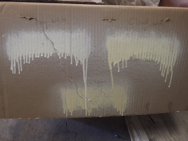 I know the cardboard can change the color a bit but New White(top right) looks correct compared to Cloud White(top left) and then Cream at the bottom. If you look at original ad pictures New White looks similar to the wheel centers and cab roof. |