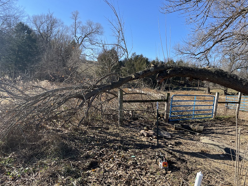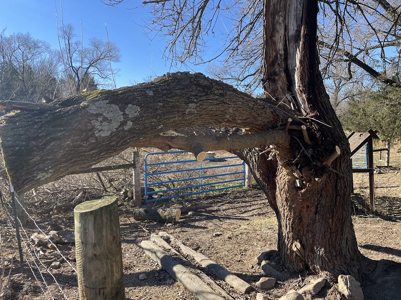 This is Vernon's Home and the Tree, half lays from the Little White Pumphouse to the right, the bigger side is laying across that pumphouse and well into the drive around his house. Gonna take someone with a Crane to lift and then block that where a Arborist or Tree Removal Service to remove that.