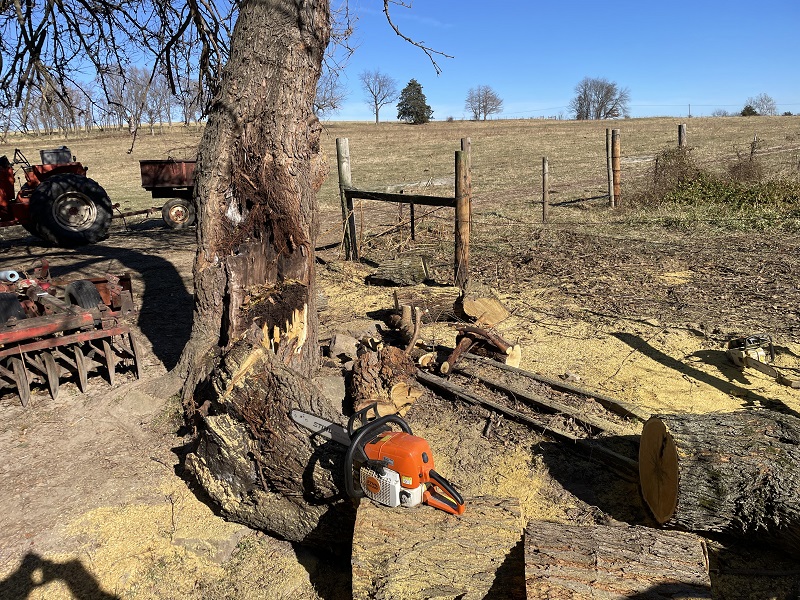 Been neglecting some of my farm work doing other things as House Build, Truck Rebuild, Truck Herding, even vacationing. Old place is becoming terrible as the day we bought it. Started marking Cedars that are coming OUT, have a few odd others, Elm, other non saleable timber also gonna eradicate, then realized stumps my previous renter had left me near a decade ago were briar and brambling out so last three days managed to get near to all needed out(18) rolled out of the holes they were in and moved to ditch to continue rot away. Three had evaded the old 7G a couple years back just as I sold it as were not easily access so those will get Stump Rot chemicals. Then had a wind storm a few years back, had neglected a old elm needed removed, it split three ways from Sunday, so today started on that widow maker. Got many limbs and section pieces of the banana peel split old Pizz Elm, then pinched the bar and bent several chain links getting the saw out. Had a spare chain so all back ready for tomorrow and ordered a couple more in case manage that again. Tomorrow out comes the wagon, load all the Elm I get cut away and take to a brush burn spot, have a few dead down trees along neighboring fence same pasture so those will get hauled as well. Just in time for Rain TH FR and SU. Next Week traveling to Tulsa, friend of mine is getting married and invited the wife and I, he was the KW Owner at one time. Once back hone will start on Cedars. MO Mulch was paying $60/ton for NOTHING Greenery Cedar, may get a few loads up there in the coming months. Come Spring, will most likely purchase a New To Me large capacity sprayer, looking forward to getting Remedy or Grazon down in multiple fields. Will be setting up a Wand for that tank so can hit Fence Row Multi Flora and Locust saplings. Really want to clean the place up as next step is different better spacing Cross Fence and gate locations, bought a Shaver M8(?) and will be adding Steel Pipe Posts at spots for gates or corners. Next summer will be adding another Cobett Waterer up by house off the well there. Have a bunch of Dead or Dying trees need thinned at several points, more burn pile fodder. One last consideration is may Disc Off a couple of smaller fields after the Grazon/Remedy attack, seed up more Brome for bales. Thoughts are moving to the renter letting go of this lease so time to make Hay while the Sun Shines, possibly add a feeder or two just for our use. Still for the life of me, How did any of us get all this stuff done and work too, am Retired now and seems cannot catch up.