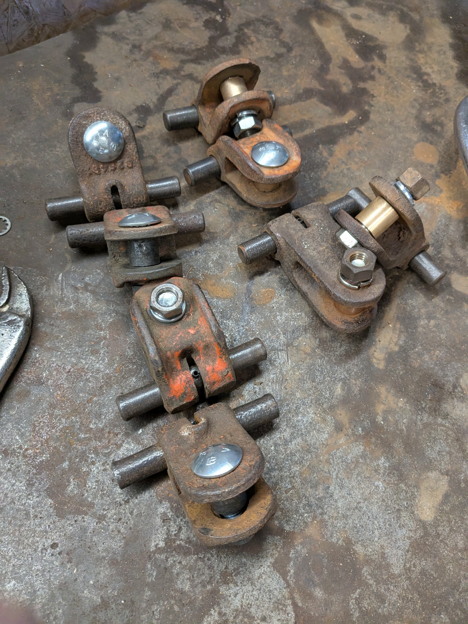 I took a couple of lift hooks off one of my snap coupler plows. Good thing I did - not much left of some of those bolts! I decided to take all my other ones off to check as well. They are all getting replaced. I would hate to see if one of those bolts failed while going down the road. Also switched out the bent over nails in the pins for proper roll pins. ![]() ![]() |