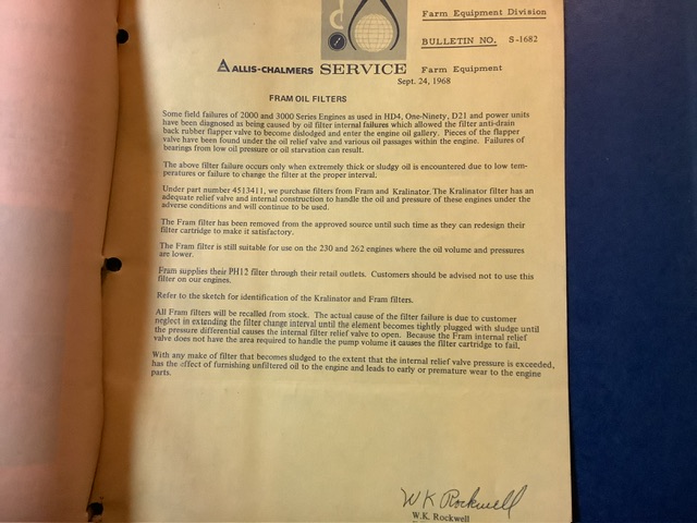 DanielW : Do you remember years ago when WIX remade the packed cotton type filters our Allis Chalmers engines with the Bypass filtration system requires with a pleated paper design? You must not. These filters caused very low oil pressure and ruined many engines. As the saying goes "Fool me once, shame on you. Fool me twice, shame on me." And to that I have to add if I allow myself to be fool the second time, I'M an idiot.