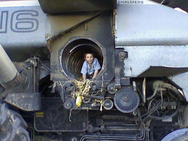 The first one was from today out on the 80 acres.. The corn was running good.. 1 round and we were having to unload.. Kept the boys busy today... The next one is our youngest son Shane... He was cleaning the corn out of the rotor when the spline coupler went bad on us... That happened to us Friday.... Not to mention what happened last week already.. Grandpa was in the field with the other N5 when the motor blew up on it..With a couple attachments we put the corn head over onto our bean combine....