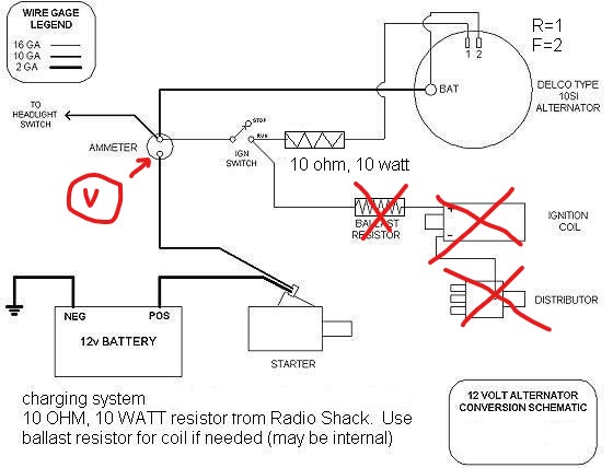 Since I have a diesel, I don't have the ignition coil, distributor or ballast resistor to worry about. It seems that I don't need the external voltage regulator installed below my dash. Can I remove it? I also don't have an ammeter but rather a voltmeter in my dash and I assume I can use it rather than an Ammeter? Here is a 10W/10Ohm resistor that I am going to use. ![]() I am not sure about sending the wire to the headlight switch from the Voltmeter? Is that what I want to do? I haven't tracked my ignition key wires yet but do I need to do anything different there? So, here is what I think I need to do to wire for a 3 wire alternator setup once I get my alternator fixed. Thanks for the help. ![]() |