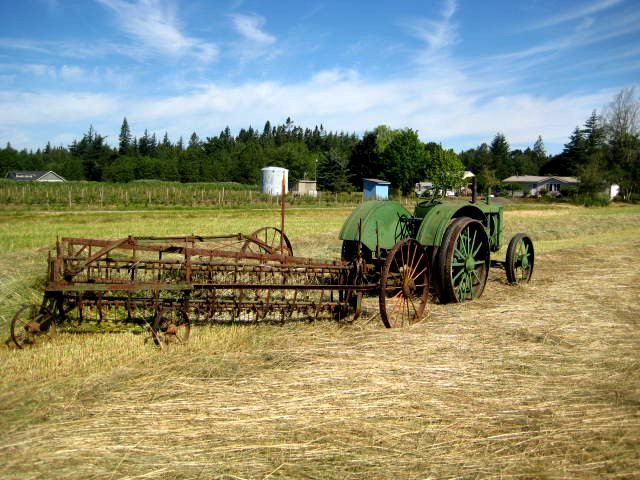 Finally dried out enough to get the hay done last week. After mowing with my John Deere 2040, I thought I'd make the rest of this chore fun, so I raked with my 1928 20-35 and JD 594 rake. Then a buddy came over and we baled with his AC 175. Had a good time.