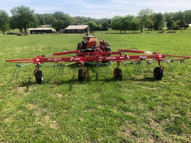 I'm just like a little kid. I had to get my new toy out and play with it, and show it off a little too. I got this new four basket tedder. It's an Enorossi brand. Vortex is the tedder line. I got tired of the little two basket, it took forever to get over a field. I try not to tedder hay that much, usually only when it gets wet. I may have to tedder more this year just for fun. I been going around the pasture scattering hay the cows didn't clean up. It sure runs smooth, I'm used to a machine rattling, clanking, and sounding like it's going to fall a part.