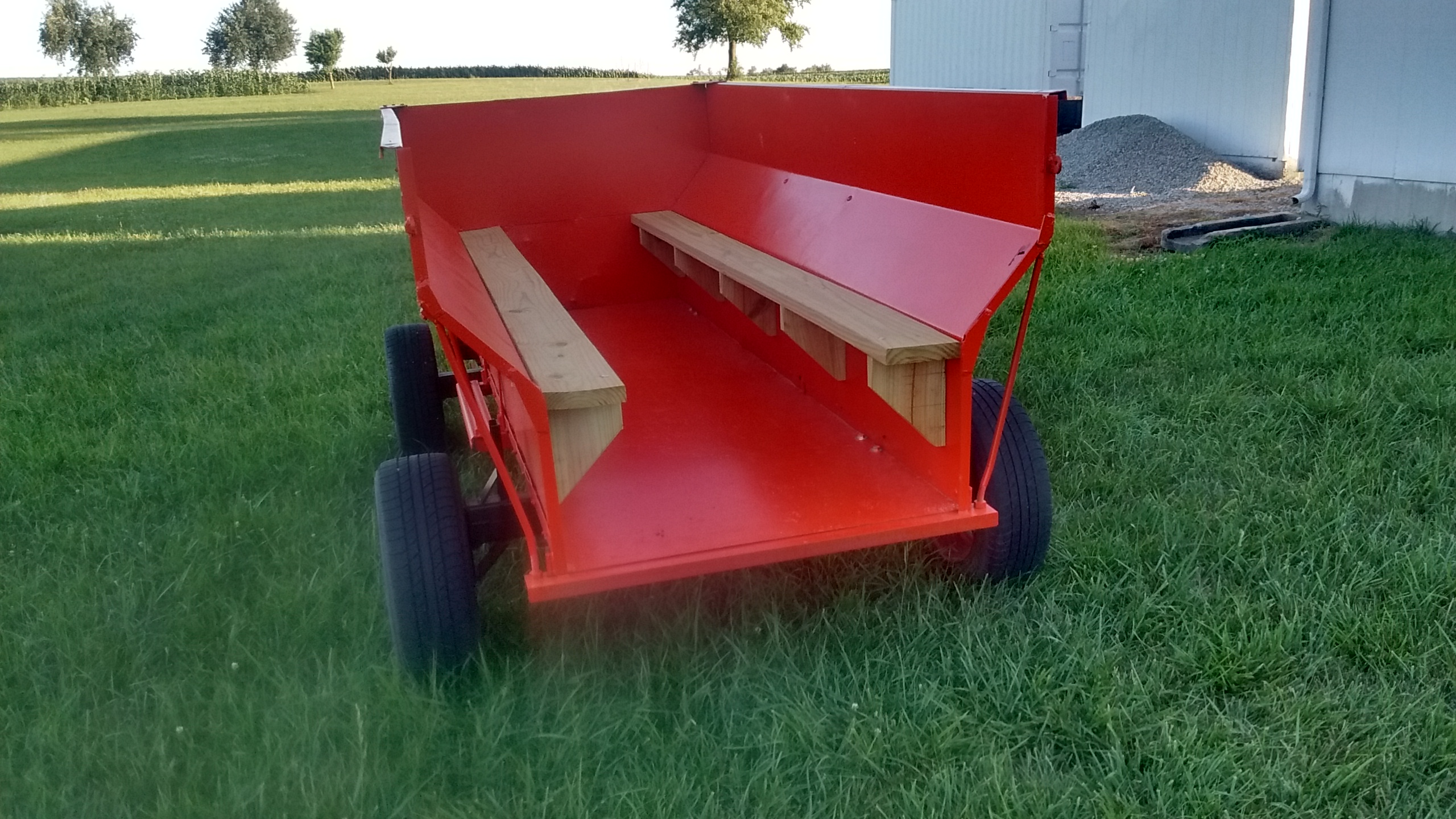 I built one a couple years ago.  If the photo loads, we did a hay-less hayride at the local park last Halloween.  Seats 12 adults.  Been pulling it at the Indiana State Fair tractor parades.  Used the running gear from a V bottom grain wagon.uploads/1025/Wagon_picture.jpg