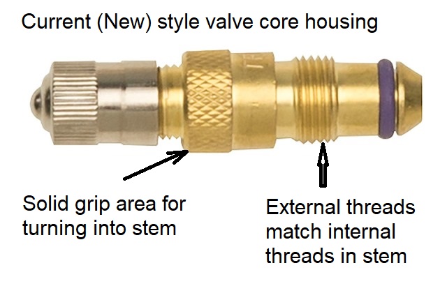 Here are pictures of the Old and New (currently used) valve core housings. You may want to have both on hand when you do this.