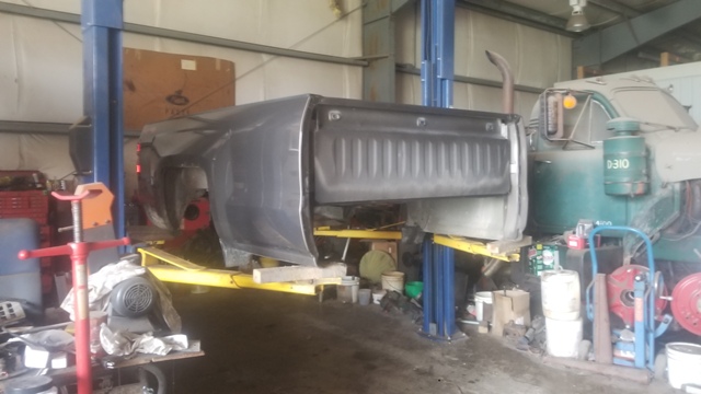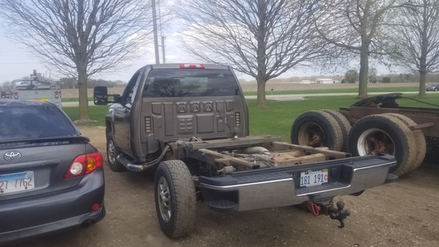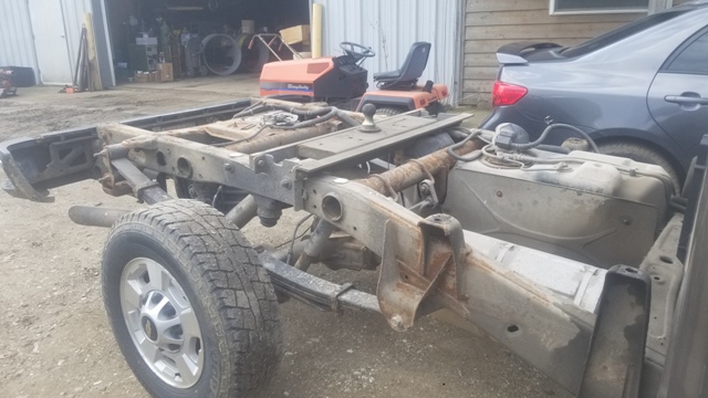 Bed lifted clear of the frame: ![]() Chassis out in the drive: ![]() ![]() They have located a dually rear axle I have yet to retrieve and install. Should be a nice package once complete. I pulled the bed to measure up and fabricate a materials list for mountings and weldments to attach to. They are going to sell the original bed including the bed, B&W hitch, patch panels for the wheel arches, and rear bumper for $1500. The rear camera in the tailgate works well also and the bed is not bent up at all; just rusted over the wheel arches. |