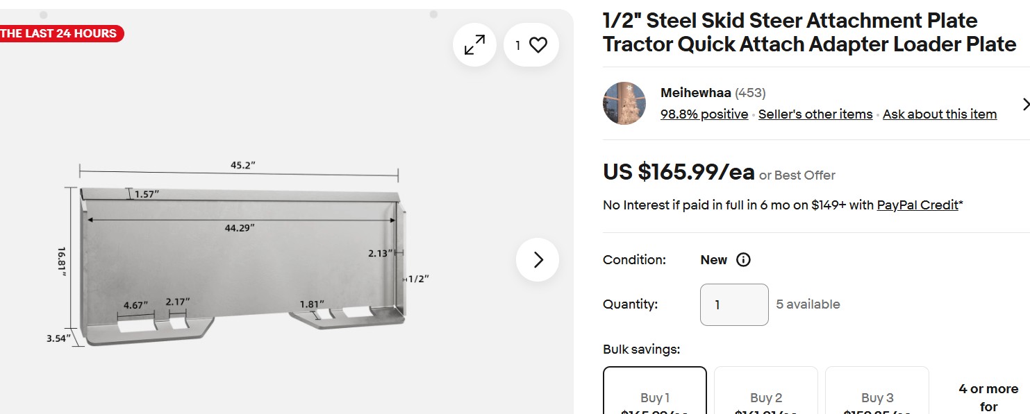 GOOGLE----------- Universal skid steer attachments follow the SAE J2513 standard, featuring a ~45-inch wide, 18.5-inch tall mounting plate with 1.25-inch tapered locking pins spaced ~31.6 inches apart. The top angle is 45°, while the bottom angle is 120°, designed to fit most modern loaders. Key specifications include a top hook-over, bottom pin-locking system, often with 5/16" or 1/2" steel. Edited by steve(ill) - 5 hours 35 minutes ago at 9:56am |