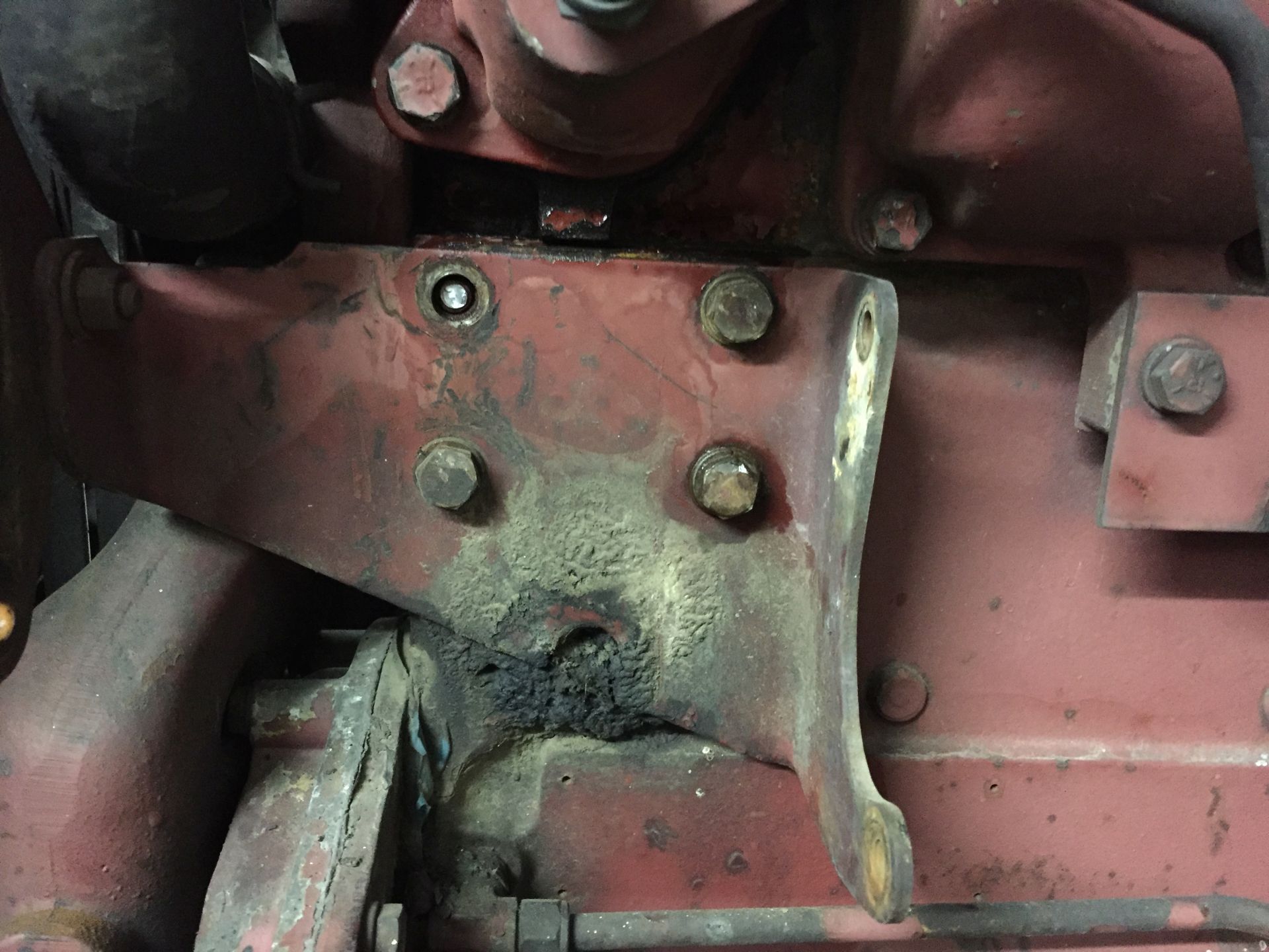 I'm thinking 1 of the 4 bolts was replaced and it's too long, breaking the casting of the block ? I KNOW if you use too long a bolt to mount the PTO shield on a D14 'bad things' can happen....