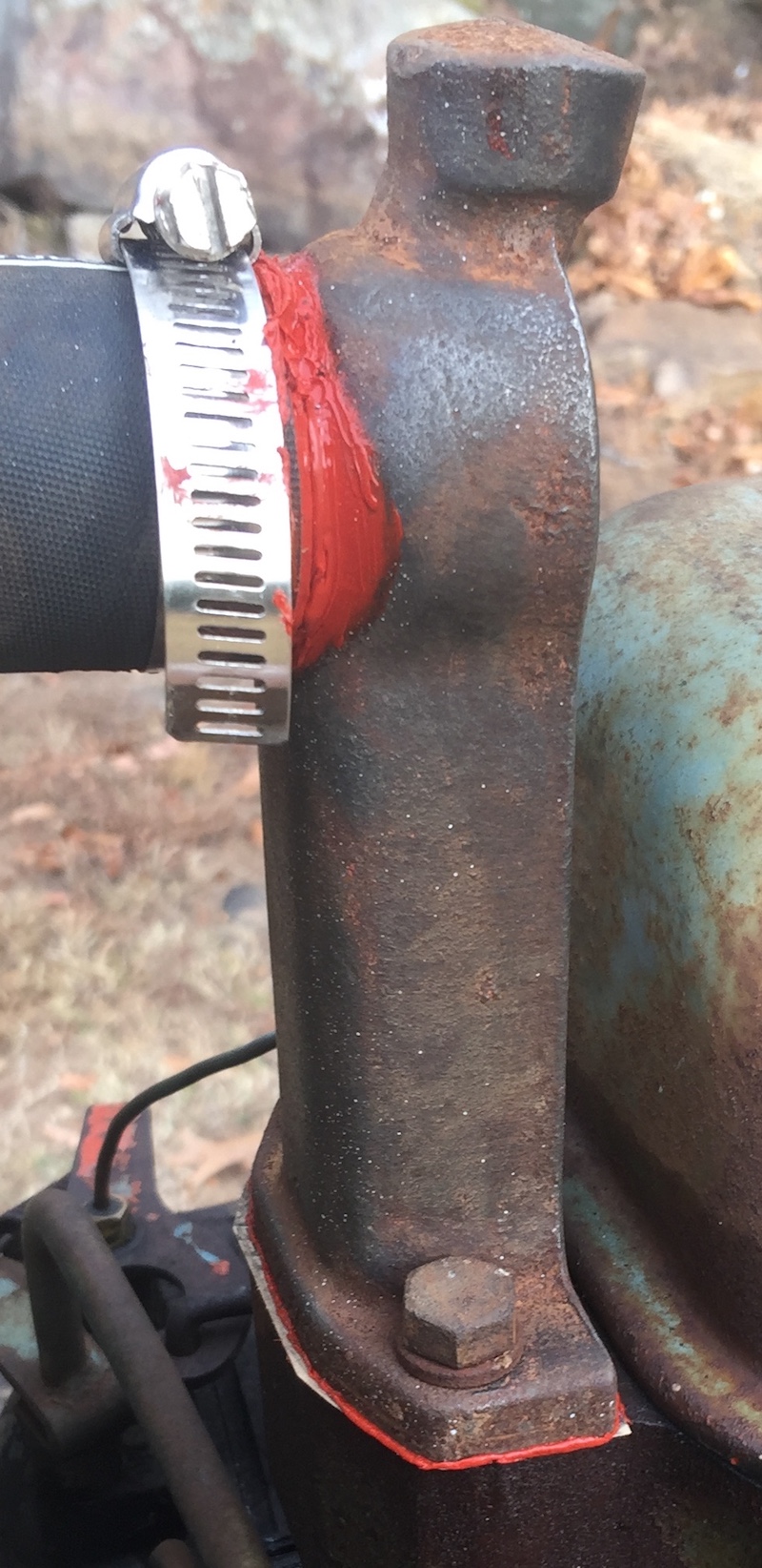 OK, here is what is supposed to be the thermostat housing on my B. I have not seen one anywhere that matches mine. I don't see how a thermostat could fit in this at all. It would have to be placed inside the upper hose somehow, and I don't have a clue how that would work.