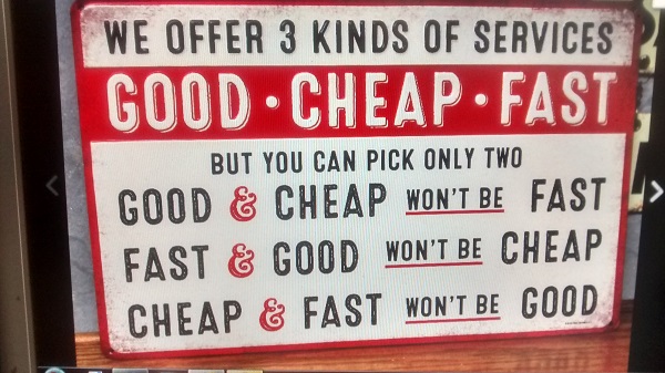 I offer one kind of service in the shop "RIGHT" and it might not be fast or cheap, I try to be good and think is always better. I have tried the fast and the cheap and always cost's me the money in the long run. I learned over the years to turn down work if it's got to be done fast or cheap.