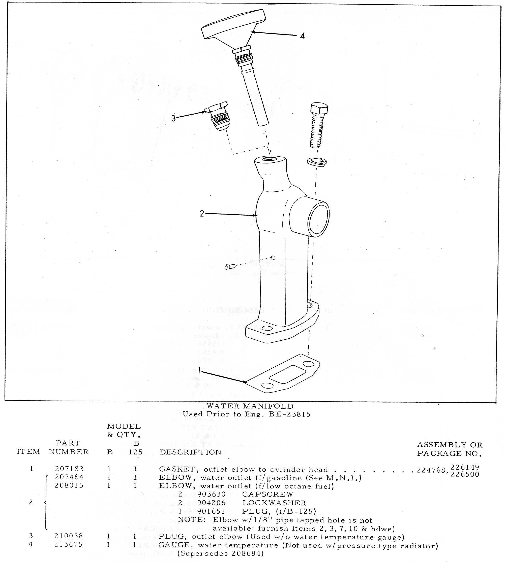 The part number for the elbow used for gas is 207454. Part number for untapped elbow is unknown.  My radiator is non presureized . I have a hole in my hood for a gauge. Anybody wish to trade even your tapped casting for my same casting without it being drilled and tapped for the gauge.  My guess mine is for a BE engine  prior to 23815