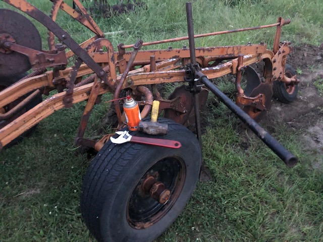 Of course only God knows how many years it's been since this plow has seen any work.  After a thorough greasing, rub down on the moldboards I attempted to see if I could turn some dirt.  By the time I got to the opposite end of the garden it decided to dig into the ground but the lift mechanism didn't spin around enough so when I pulled the rope it wouldn't lift.  Will go out tomorrow and pick it up with the skid steer and maybe make another run at it if it doesn't rain.  Doing my best not to say bad words.