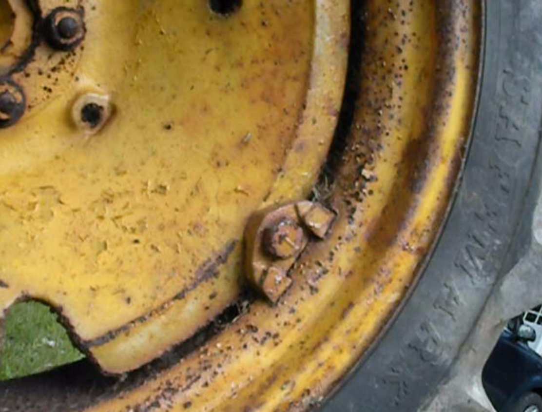 While the wheel doesn't look too bad in this picture around the valve stem the metal is flaking off badly. Can someone confirm this is the 211201 rim? I am away from tractor and this is only decent picture of the wheel I could round up. One of the 4 clamps looked like it was trapped/straddled by welded on drive lugs. This is from memory, I could be wrong. Are replacement rims available? Would they have the drive lugs? How about repair of rotted out rims, is it commonly done, and how? The tractor is painted wrong colors, I will change that. |