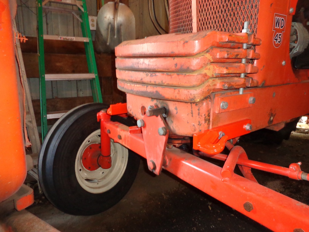 I trailer my WFE WD45 a fair amount. Used to just run a chain around the front axle tube and bind her down. After the front-end rebuild and painting I can't do that anymore. Have been using 1/2" 'swivels', down side is they have to be removed before moving the tractor as the hoop would hit. Found a couple of weld on chain hooks in the shed awhile back and got this idea. Found some flat iron the right size, little welding, little paint, wala!