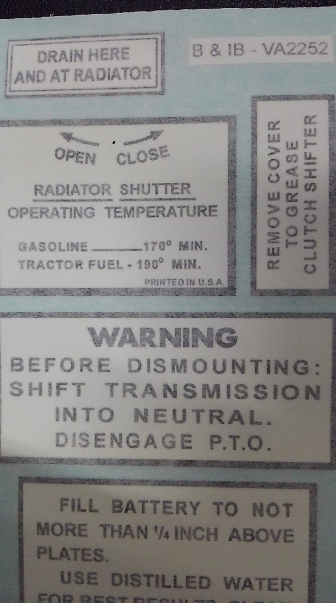 Have two decals not sure if they are used, and if so where they go. One is the dismount warning and the other is the clutch shifter grease plate removal. Any ideas? It is a 1939 B. ![]() ![]() ![]() ![]() ![]() |