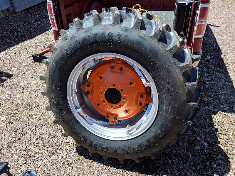 Changed the oil in the 175D brushhogging tractor, took the 18.4-34's off another 175D that has wiring issues and put them on the 6080. Put a set of Deere wheels on it to roll it around. Put the 15.5 x 38's that were on the 6080 back on the brushhogging 175D, now it is ready to go. Have the 18.4 x 30's that came off waiting for their next assignment....