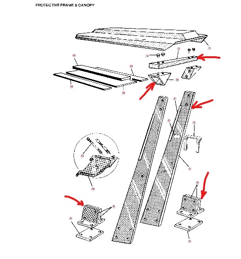 Would anyone have an original ROPS and be able to provide me with dimensions of the arrowed parts? Also the what is the angle in degrees that the main support leans backward? Thanks in advance. ![]() |