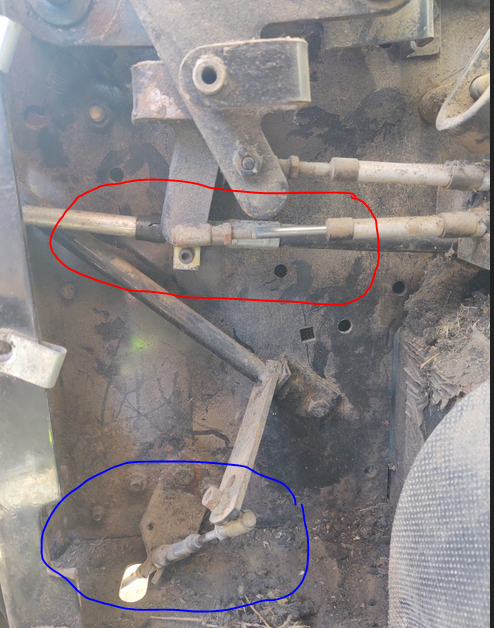 I have a 16 speed power director 7010. I started putting some equipment away in the barn for winter. Was shifting out of low into park and got half way out of low and the lever got stuck. Can't move it forward or backward. Tractor won't move either so it is not in gear. I have had a little trouble shifting into park lately so this problem may have been waiting to happen. I don't know much about this setup but my guess is that it could be the park cable is stuck or it could be the hi/lo cable is stuck. Worse case scenario is the shift fork in the transmission? I think I need to disconnect the park cable and see if that allows movement. If it doesn't then disconnect the hi/low cable and see if it moves. Most importantly, looking for steps to debug the problem. Any help is appreciated! Here is a picture of the shift cable area. I used red for the hi/low cable that looks a little bent to me, and I think the blue is park cable? Last, the dang tractor is half in the barn. Can I pull it out about 10 feet so that I can shut the door? |