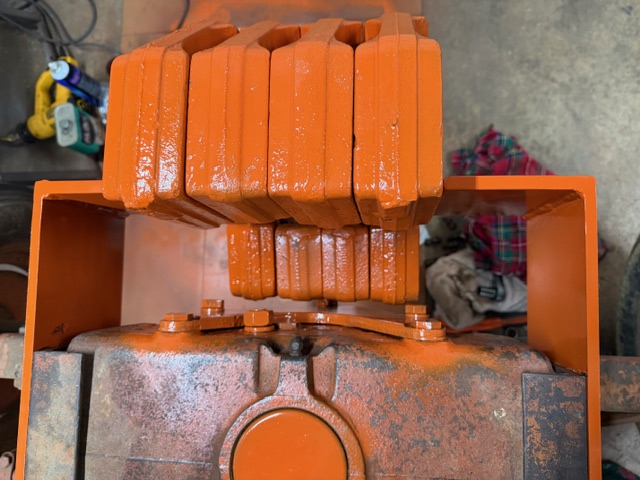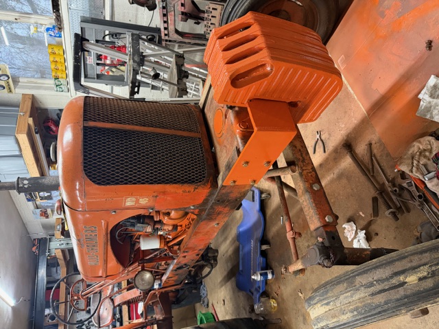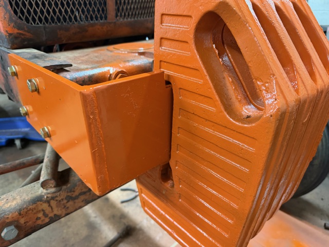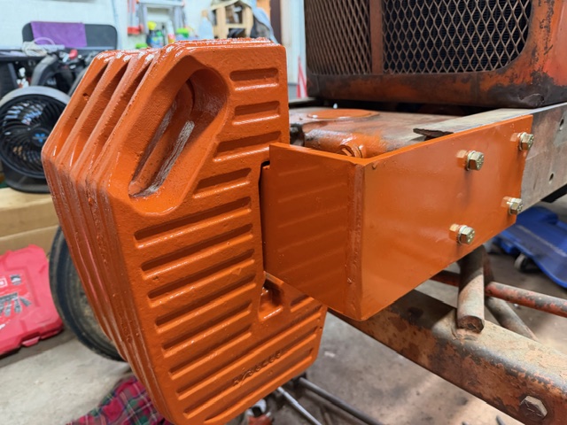With the help of a local welder I made up this front weight bracket to hang these suitcase weights I had. I also cleaned up the weights and painted everything Persian Orange #1. The bracket weights 30#'s and the four weights are another 280#'s. This should make lifting heavy equipment and pulling the three bottom plow a little more efficient!