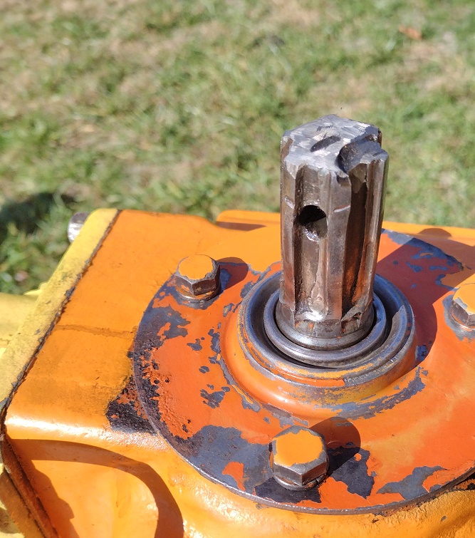 Here's a picture of what I'm dealing with currently. The splines are so far gone the overrun clutch wobbles way too much on the PTO shaft. It appears that the shaft has been cut shorter, probably making the wobble even worse. The hydraulic pump unit is there on the left.