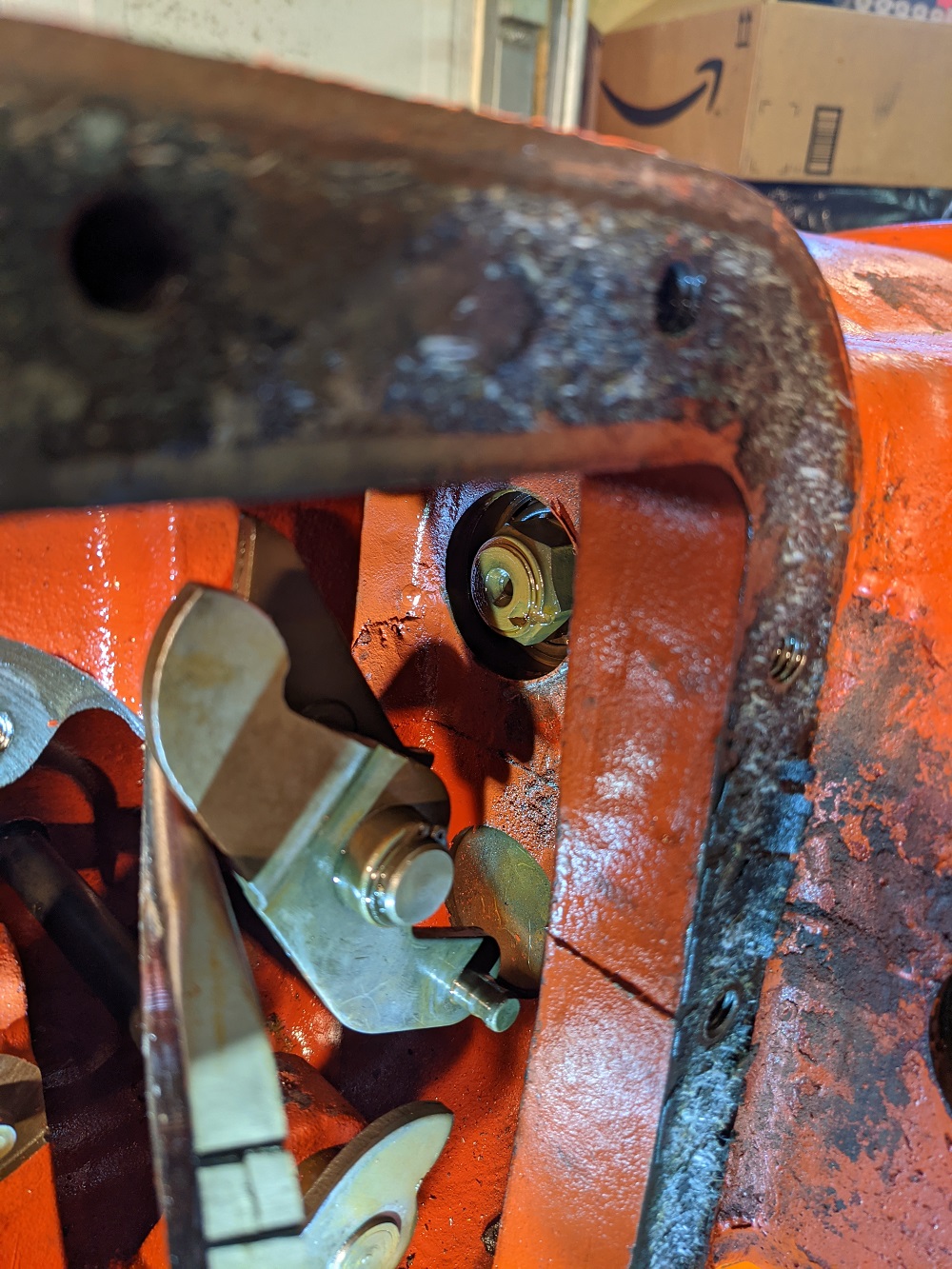 Looking rearward from bottom of torque tube/hydraulic pump cover. That's the linkage of the hydraulic pump in front of plug. ![]() |