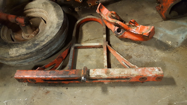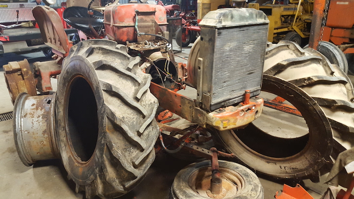 I was by the shop yesterday. Rear wheels are back on, engine is back in (with new clutch and ring gear), rebuilt starter is back on, etc. Still waiting on welder and front axle to finish putting it back together. Since tractor has been sitting, at least a quart of oil has leaked out of the rear axle. That is in addition to a small leak I found while she was sitting in my barn. Once she is back together and running, we will need to find the source of both leaks, but also to find out if the transmission is good, or if she jumps out of gear. Stay tuned!