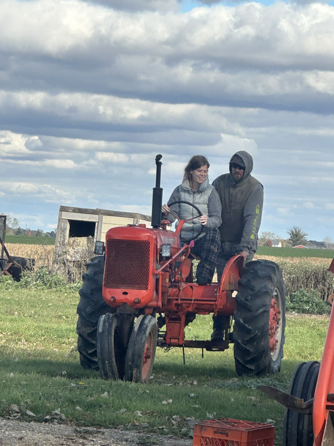She was pretty bummed when I sold the WD I was planning to restore for her. Ultimately it just needed too much to be worth the effort. So after looking around all summer a I got talking with a buddy of mine who is a local Allis guy, and he said come over I got something to show you. A few weeks later it was in my garage. Seems like a good runner, needs the carb/governor linkage addressed. Needs a brake job big time and the hand clutch either adjusted or rebuilt, and the paint is really slopped on over dirt and old paint, I don't think whoever painted it even used primer. So I suppose Ill sand blast it straighten the tin and give it a good coat of PO1. Should be a fun little project.