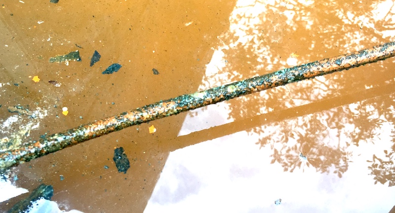 OK, here is a shot of the anode. I went and pulled it before the normal length of time to show what I am talking about. Had this been running for the normal 6-8 hours these dark blueish deposits would be much more obvious. Some of the deposits fell off into my drum of electrolyte and are floating in the background. The drum had metal mold release agent residue when I got it, but 99.9% of that was gone before I put it to use. Basically that stuff was just some sort of oil and I don't think it has any effect here. If this is lead from the paint it might be a good indicator that the rust is about gone. I will turn the fender again and run it all day tomorrow. After that I will snap another picture of both the other fender that hasn't had the electrolysis applied and the one now in my tank before rinsing and wire brushing. I am absolutely sold on this rust removal system even if a little lead is involved. Considering all the sinkers I clamped shut over fishing line with my teeth if lead was gonna get me it already would have. Edited by theropod - 31 Oct 2017 at 4:19pm |