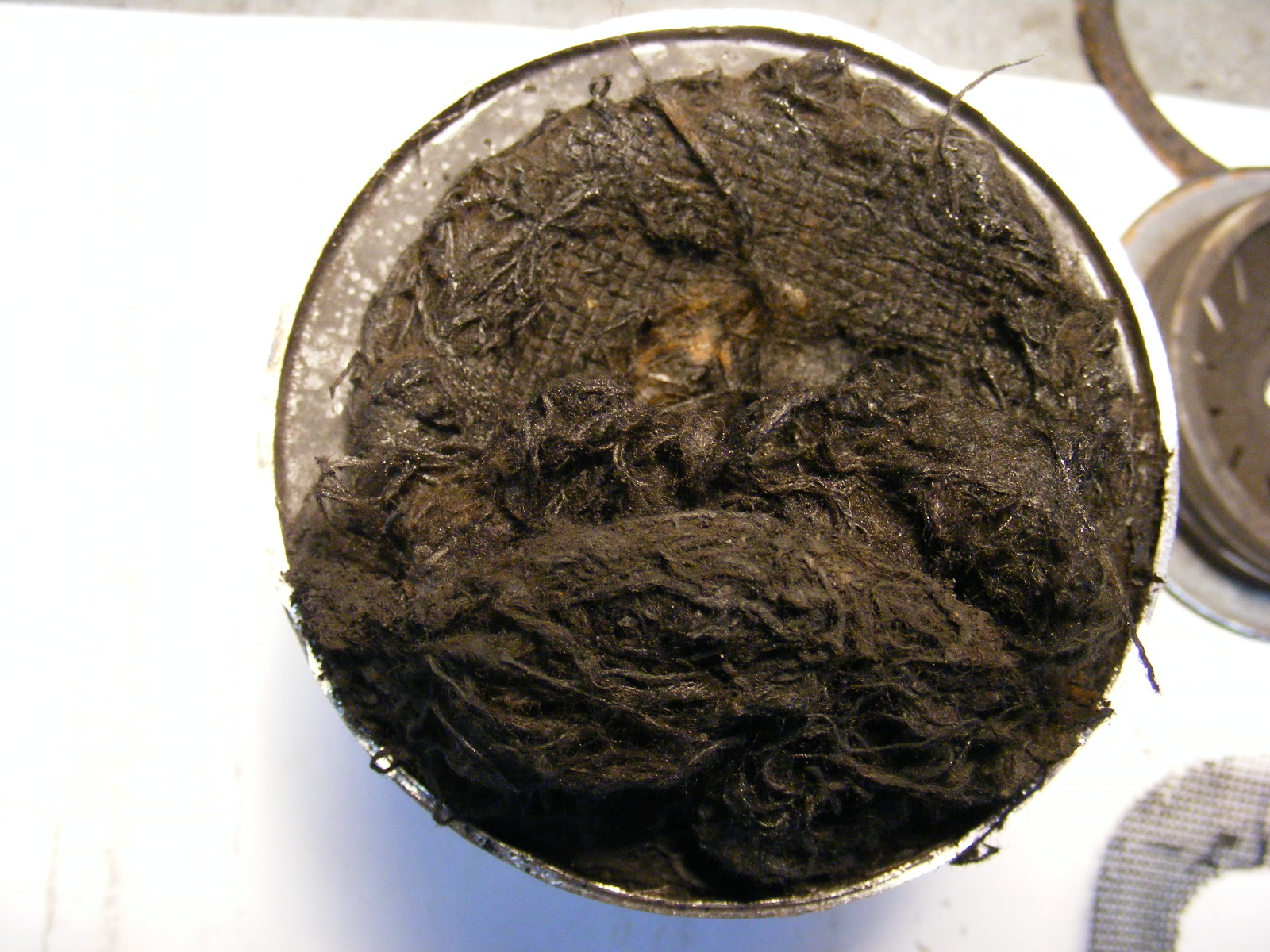 I opened up an old AC flat top filter today and it looks like its tightly packed with cotton string. On top of that is a piece of metal screen, then the threaded cover with the slotted metal dished piece in it.