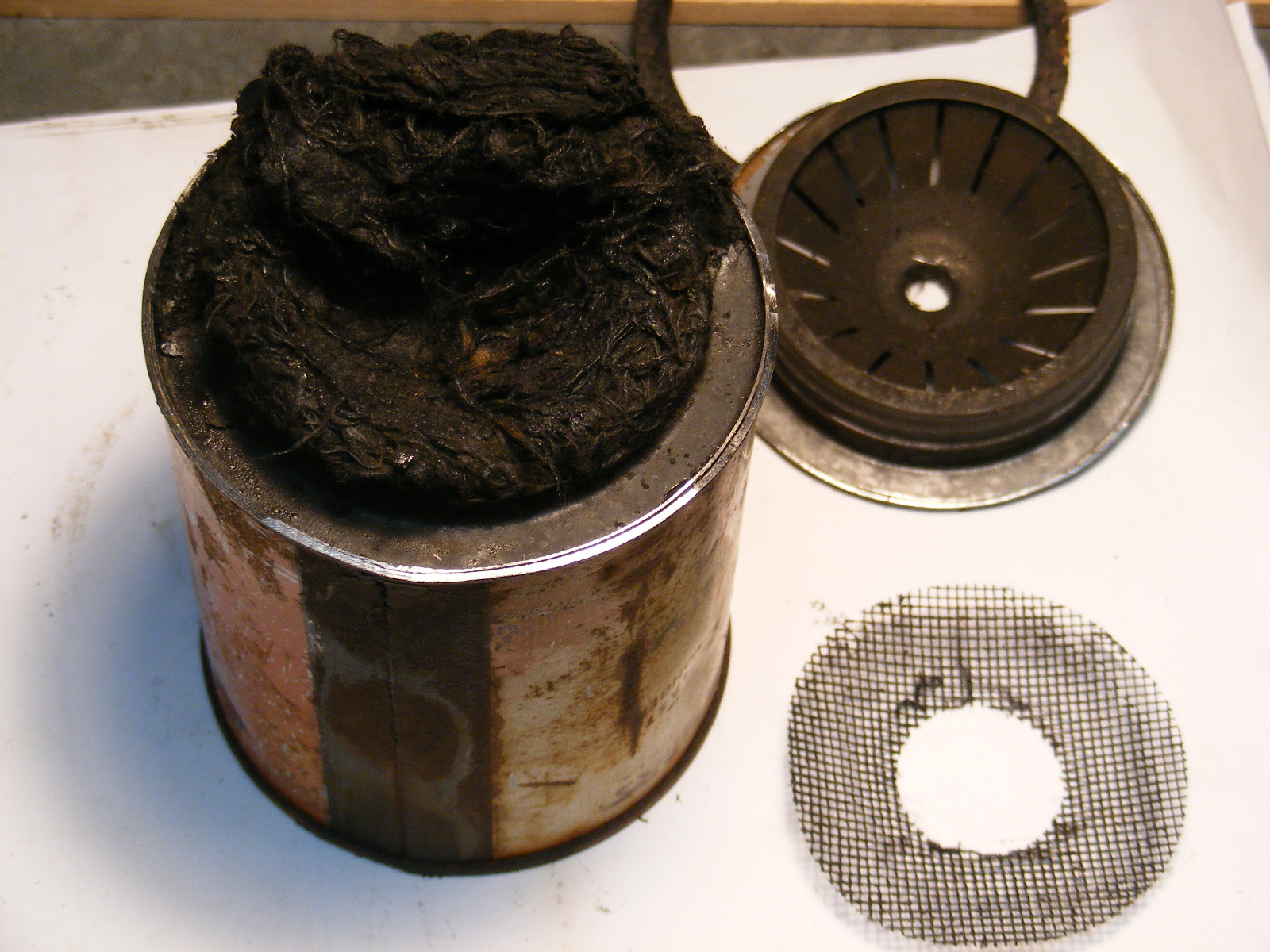 My dad always called the filtering media "Excelsior" wadded up cotton; similar to packing in early railroad car bearing journals that required lubrication. R. Musgrave