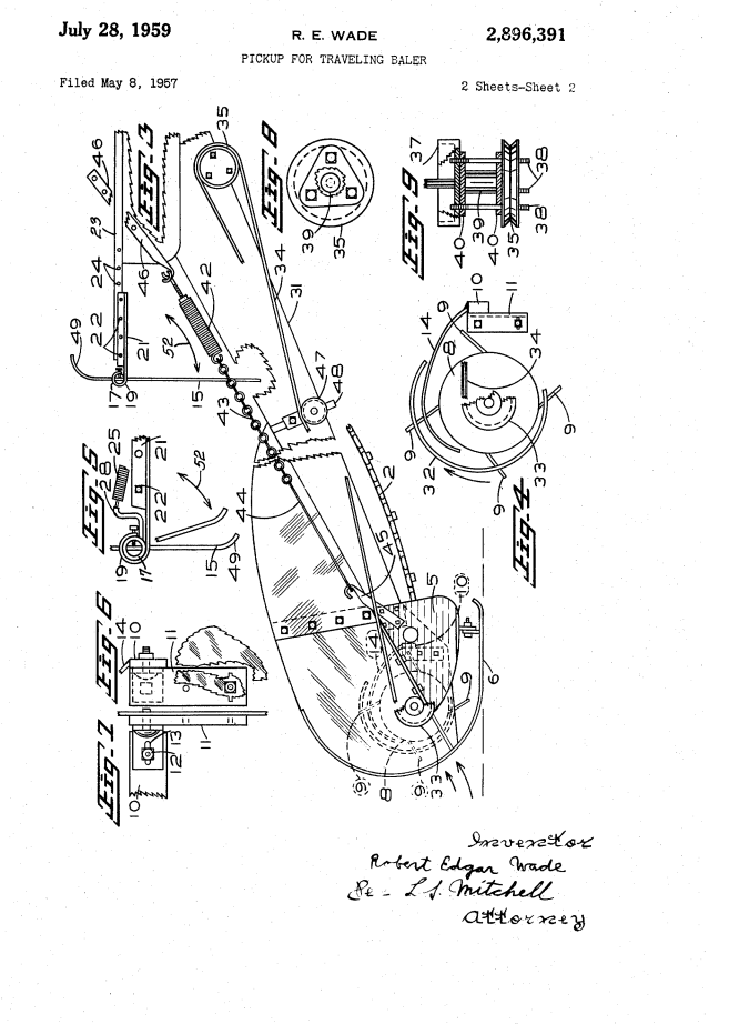 Bingo: Found the original patent from Wade relating to their continuous pickup for a rotobaler. They clearly couldn't (or didn't want to) specifically mention 'Allis' or 'Rotobaler' in the patent application for liability and/or adaptability concerns. Read the two highlighted paragraphs in the lowest picture for mention of 'continuous' operation. https://patents.google.com/patent/US2896391A/en?oq=US2896391A