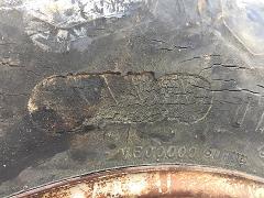 I got some time this afternoon to mess with the parts tractor and had some decent results.  I got the chains taken off and got the bolts holding the weights to loosen up.  The left tire actually looks okay, all things considered.  The flat one on the right surprised me and didn't turn out to be as bad as I thought.  What I thought was a crack was just a place where a layer of the tire came off.  No cracking that I could see from the outside.  At this point if I can get them fixed I think they will work, but it remains to be seen.  At least I'm more hopeful.  They appear to still be somewhat soft and pliable so maybe they can be worked with some.  Hopefully I can get it to work, they are still a good set of tires, not much wear on them.  I think I'll start checking with the local tire places in a week or so to figure out what I'm gonna do.  If I can figure out exactly what product he used I will post it on here.  Thanks again for all the advice.