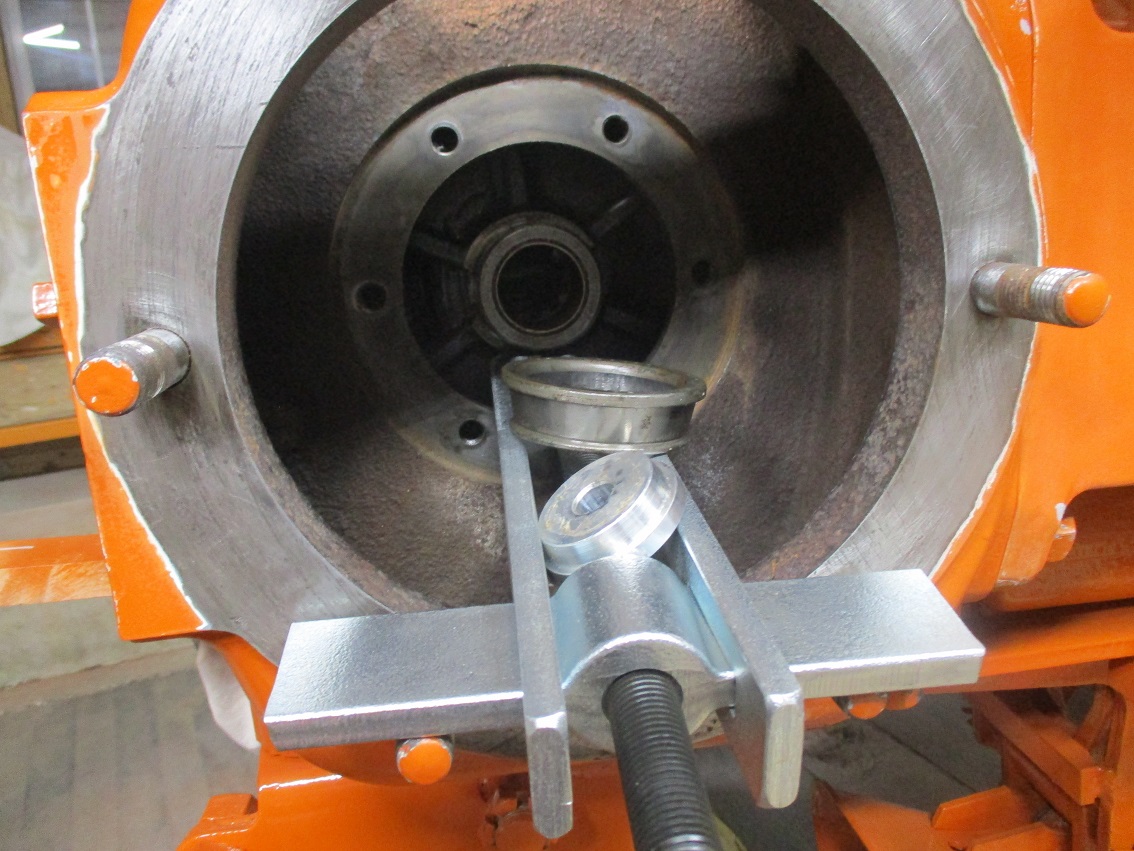 I'll preface with... I've never had to pull one of those before, but almost looks like a threaded rod with big backing washers on back side, with a piece of pipe and nut/washer on the front would drag it out... or a slide-hammer... But if faced with failure there, my ultimate go-to would be to chisel the cage, then reach in there with the smallest MIG gun, or a 1/8" 60-series rod and apply a bead around the inside radius of the race, and let it cool. As it does, it'll shrink the race to the point where it'll basically fall out. Duhp! Ya beat me! Cool deal,and congrats! Great pix, btw!!!