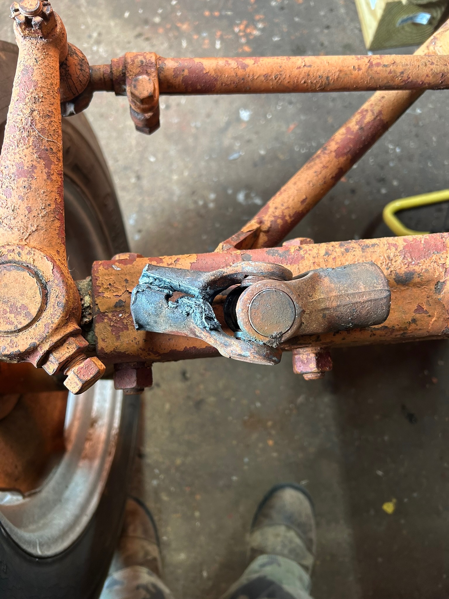 Spent 2 partial days removing the NF and installing the WF. The steering universal joint was a bear to remove, well mainly driving the pins out. Had no luck driving it out so I decided to drill it out. Got a 1/8” carbide drill bit thru, went to the next bit but snapped off right before exiting the other side. It felt like it grabbed hard and snapped. So, my buddy Mutt pulled out his torch and he proceeded to get it red hot as I started to drive the pin. Finally after a half hour of pounding the pin came out. Drove it off the shaft and then removed the NF. The next day the process of getting it off the steering shaft started the same way but I couldn’t budge the pin until once again heating it cherry red. Finally drove the pin out. Tried to drive the universal off the steering shaft, even with it red hot it wouldn’t budge. The universal needed to be replaced because it was worn out so I asked Mutt to cut the universal parallel to the shaft with the torch. He did so without damaging the shaft. After some pounding it finally came off. Installing the new used universal joint was simple after cleaning up the shafts. The rest of the WF install was pretty easy. It’s all back together for the new owner.