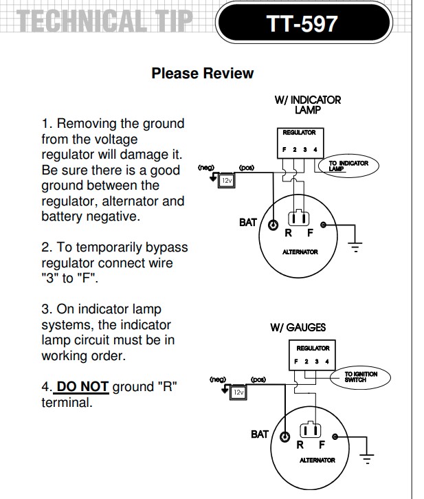 Looking at the back of the alternator, the F (field) terminal is the right spade. The R (reference aka sensing) terminal is the left terminal. You can test the 10DN alternator by using a jumper wire between the Battery terminal and the F terminal to apply power to it. This will full field the alternator and it should give you full output power. Don't run it long that way. Do not ground the Field wire from the regulator as it supplies power to the alternator field and grounding it can damage the regulator. If you are trying to use the old regulator, it may be bad. 1. Test the alternator output. 2. Use a test light or voltmeter to test for power from the regulator to the alternator's F terminal. If the alternator test ok and you don't get power from the regulator, you need a new regulator. Steve at B&B can confirm, but I believe there are some electronic ones now that might be a replacement for the old ones with mechanical points. |