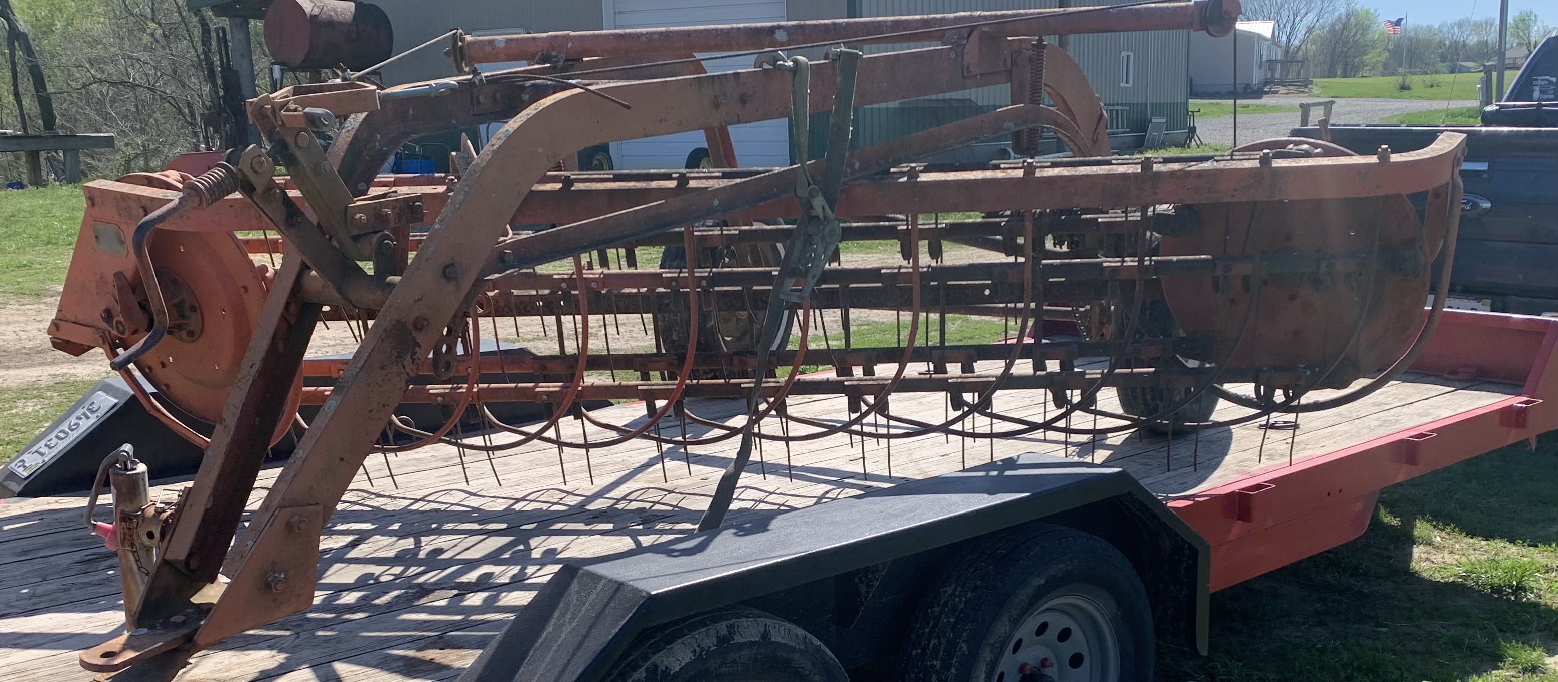 The best I can tell is that this is a model 77G rake. It’s 9’ wide, 5 bar, chain drive and a straight axle.