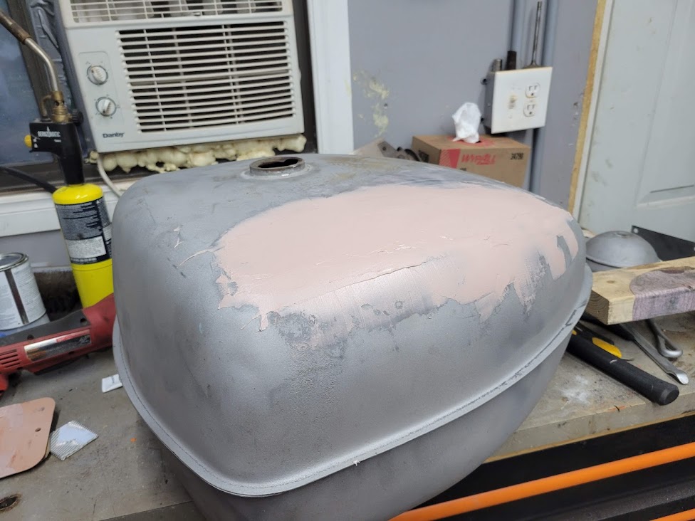I worked on the fuel tank a bit over the weekend. I was able to get the large dent slide hammered out and body filled. will be a good looking tank when finished up..