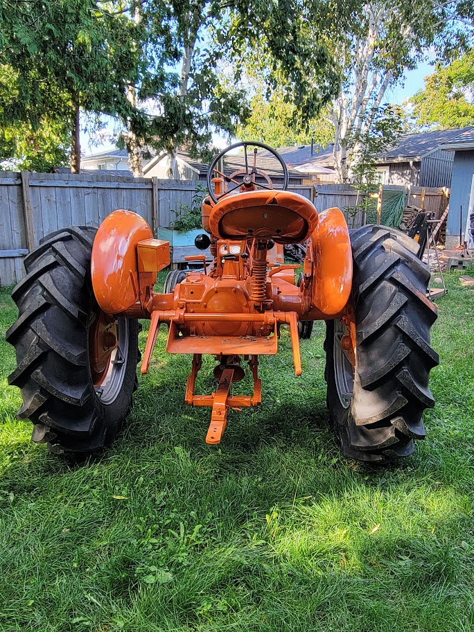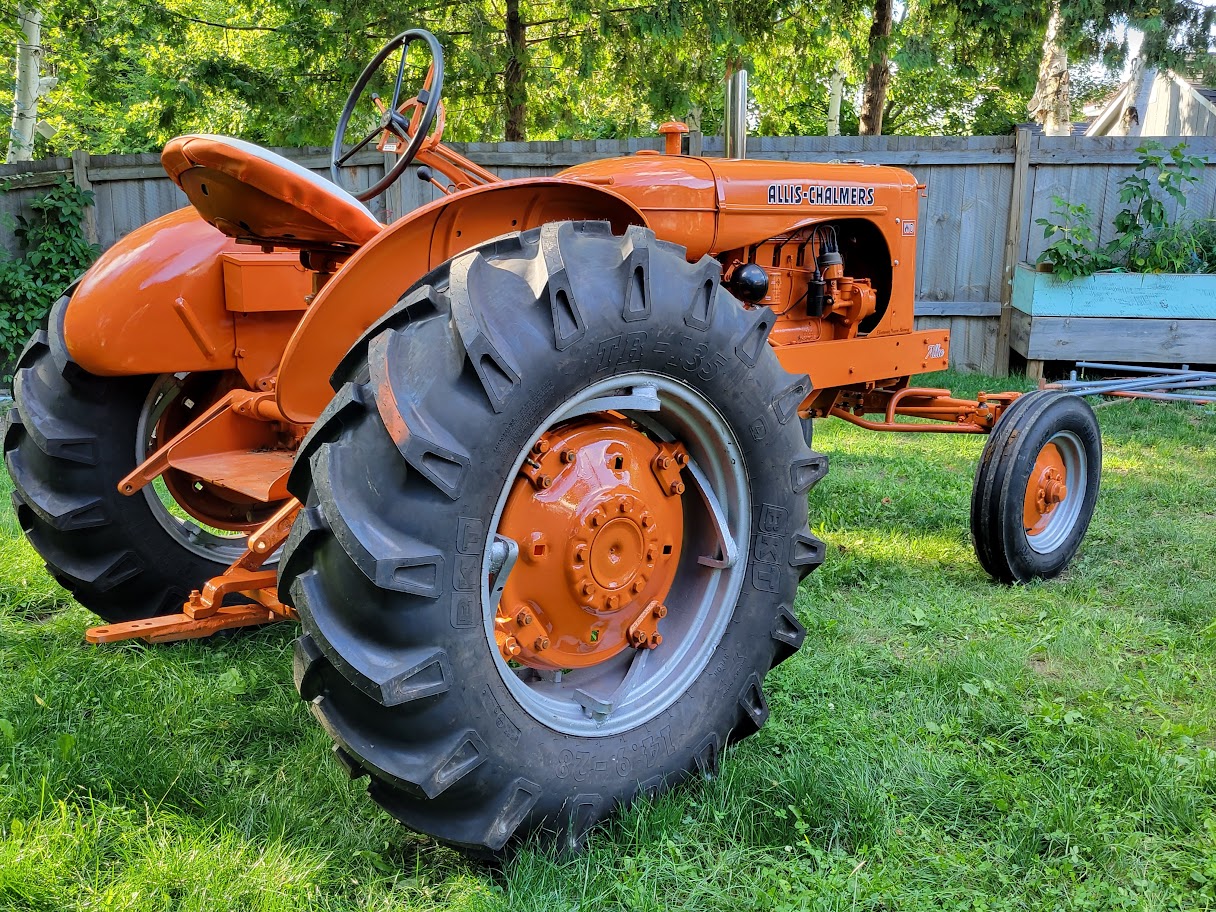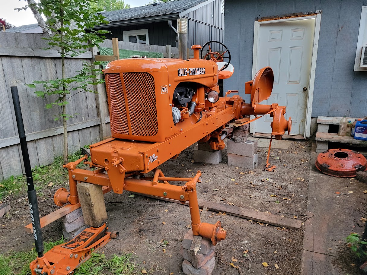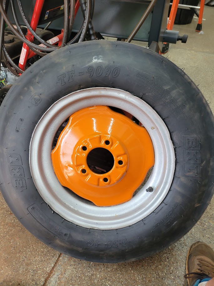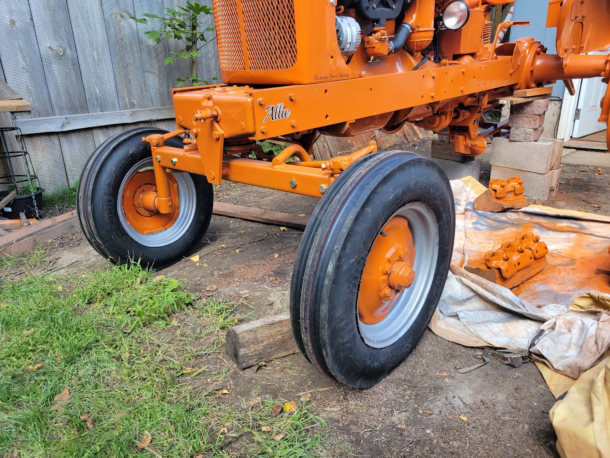I am Back! a few months of working on tractors without actually updating the forum.. Time to update! Got the fuel tank, grille and air cleaner primed and painted ![]() ![]() As well as installed onto the tractor. didn't take long to install that is for sure! ![]() ![]() I had repaired the original hood, Purchased new fenders from DJS as well as a toolbox. Took apart the snap coupler setup and painted all of it orange. Lots and lots of bodywork went into those fenders to make them smooth.. I could have hammered steel into a fender smoother than that! pretty disappointed with the fenders. First tin purchased online and it was almost worthy of repairing the old ones with the amount of work i had into them.. ![]() Here the tractor sits after all the pieces were painted about a day earlier. ![]() I was able to get some decals on about 1 week after all the items were painted. They turned out pretty good. After researching for hours on the decal placement. ![]() ![]() Rim repair was next. Man was I dreading this!! I was able to get the tires removed by the local tire shop, about 600lbs of calcium was removed.. I then started with repairs using my donor 24" rim. After about 8 hours i had the rims repaired and ready for paint. pretty tight timeline on tire installation (12 hours after painting) but I was already booked in and had to make things work. The rims were painted with Rustoleum Hammered silver finish paint. That is the closest thing to galvanized i could find. 3 coats did me well. ![]() ![]() ![]() While i was getting these tires taken care of, Allie was looking a bit upset to be back on blocks... but hey! at least the jack matches! ![]() Here is the tires while i was at the tire shop, I went with BKT tires all around, 5.50-16 up front and 14.9x28 bias ply in the rear ![]() ![]() ![]() Once the tires were taken care of, It was onto the rim centers, Front rim paint and power shift guides. These powershift guides were so seized, I had to smash them apart and heat the snot out of them while impacting to get them loose. took about 5 hours for 8 pieces. Thankfully they all came free. Upon installation i gobbed them with antiseize so we wouldn't run into this issue again! ![]() ![]() ![]() ![]() I went with silver outsides, orange insides on the front rims. I really like the look of them matching the rears, So.. I just went with it! this was the rustoleum hammered silver and Persian #1 orange. ![]() ![]() And, After the rear rims were installed and powershift was locked, I was able to tour around the yard with Allie. Here are some "finished" photos of the tractor. I still have a few items outstanding that i will get to another day, But for now, The tractor is pretty much Pulling ready for our first event this weekend. ![]() ![]() ![]() Allie did take a bit of a trailer ride yesterday to get weighted, came in at 3880lbs with myself on the tractor. I have an appointment tomorrow to get the tires filled with about 520 lbs of ballast. bringing the total weight to just around 4400 lbs finished. ![]() Also.. Almost forgot! The cherry on top for pulling season here. A D17 gas governor spring. after some adjustments to the governor and throttle rod, We should be all set to go for this weekend. ![]() ![]() Stay tuned for some more updates here and there after we get some use out of Allie.