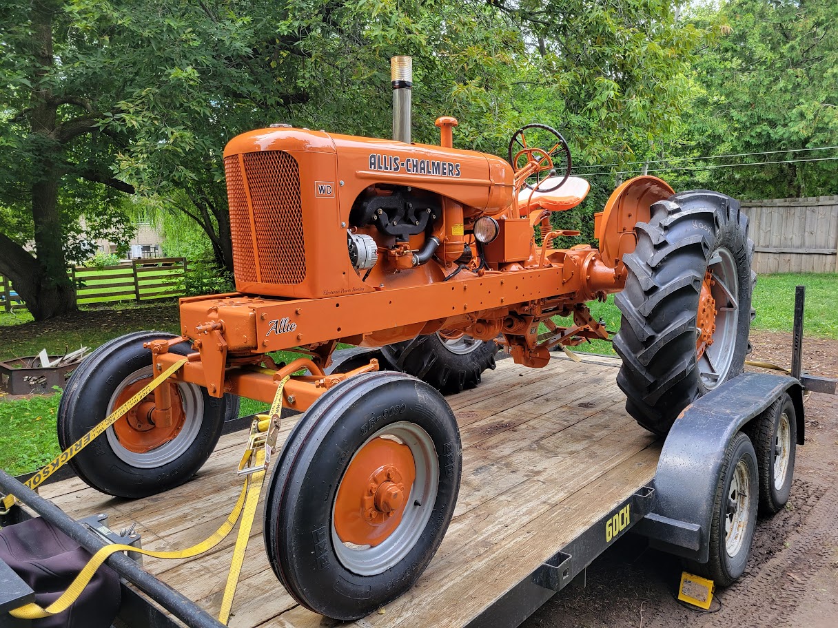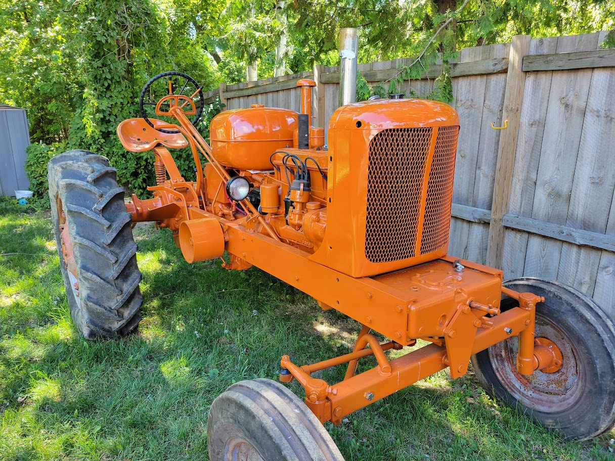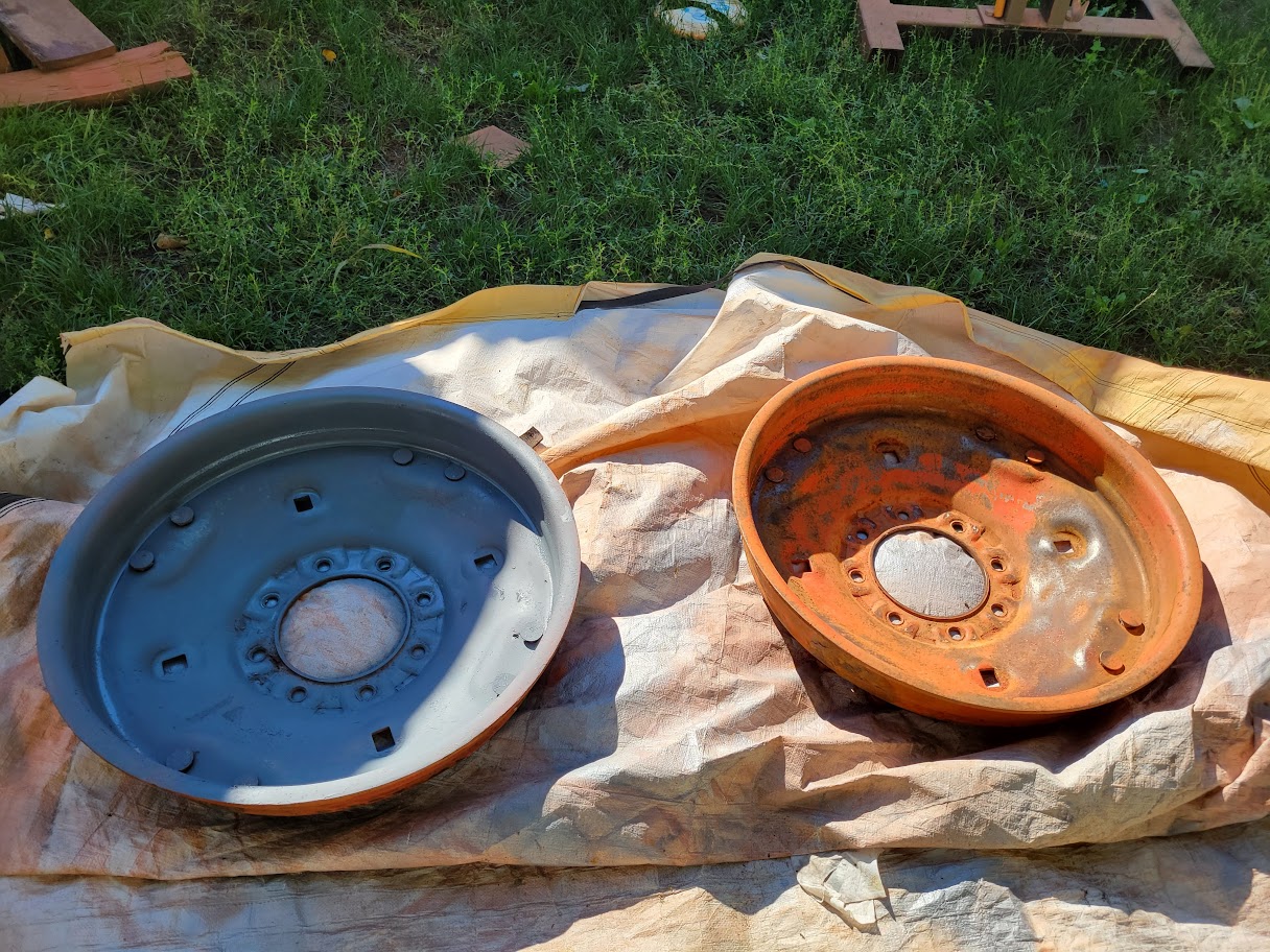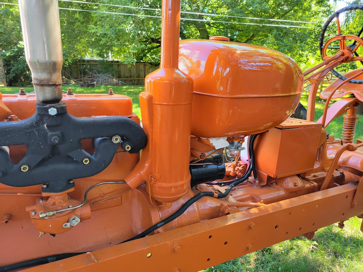 I am Back! a few months of working on tractors without actually updating the forum.. Time to update! Got the fuel tank, grille and air cleaner primed and painted ![]() ![]() As well as installed onto the tractor. didn't take long to install that is for sure! ![]() ![]() I had repaired the original hood, Purchased new fenders from DJS as well as a toolbox. Took apart the snap coupler setup and painted all of it orange. Lots and lots of bodywork went into those fenders to make them smooth.. I could have hammered steel into a fender smoother than that! pretty disappointed with the fenders. First tin purchased online and it was almost worthy of repairing the old ones with the amount of work i had into them.. ![]() Here the tractor sits after all the pieces were painted about a day earlier. ![]() I was able to get some decals on about 1 week after all the items were painted. They turned out pretty good. After researching for hours on the decal placement. ![]() ![]() Rim repair was next. Man was I dreading this!! I was able to get the tires removed by the local tire shop, about 600lbs of calcium was removed.. I then started with repairs using my donor 24" rim. After about 8 hours i had the rims repaired and ready for paint. pretty tight timeline on tire installation (12 hours after painting) but I was already booked in and had to make things work. The rims were painted with Rustoleum Hammered silver finish paint. That is the closest thing to galvanized i could find. 3 coats did me well. ![]() ![]() ![]() While i was getting these tires taken care of, Allie was looking a bit upset to be back on blocks... but hey! at least the jack matches! ![]() Here is the tires while i was at the tire shop, I went with BKT tires all around, 5.50-16 up front and 14.9x28 bias ply in the rear ![]() ![]() ![]() Once the tires were taken care of, It was onto the rim centers, Front rim paint and power shift guides. These powershift guides were so seized, I had to smash them apart and heat the snot out of them while impacting to get them loose. took about 5 hours for 8 pieces. Thankfully they all came free. Upon installation i gobbed them with antiseize so we wouldn't run into this issue again! ![]() ![]() ![]() ![]() I went with silver outsides, orange insides on the front rims. I really like the look of them matching the rears, So.. I just went with it! this was the rustoleum hammered silver and Persian #1 orange. ![]() ![]() And, After the rear rims were installed and powershift was locked, I was able to tour around the yard with Allie. Here are some "finished" photos of the tractor. I still have a few items outstanding that i will get to another day, But for now, The tractor is pretty much Pulling ready for our first event this weekend. ![]() ![]() ![]() Allie did take a bit of a trailer ride yesterday to get weighted, came in at 3880lbs with myself on the tractor. I have an appointment tomorrow to get the tires filled with about 520 lbs of ballast. bringing the total weight to just around 4400 lbs finished. ![]() Also.. Almost forgot! The cherry on top for pulling season here. A D17 gas governor spring. after some adjustments to the governor and throttle rod, We should be all set to go for this weekend. ![]() ![]() Stay tuned for some more updates here and there after we get some use out of Allie.