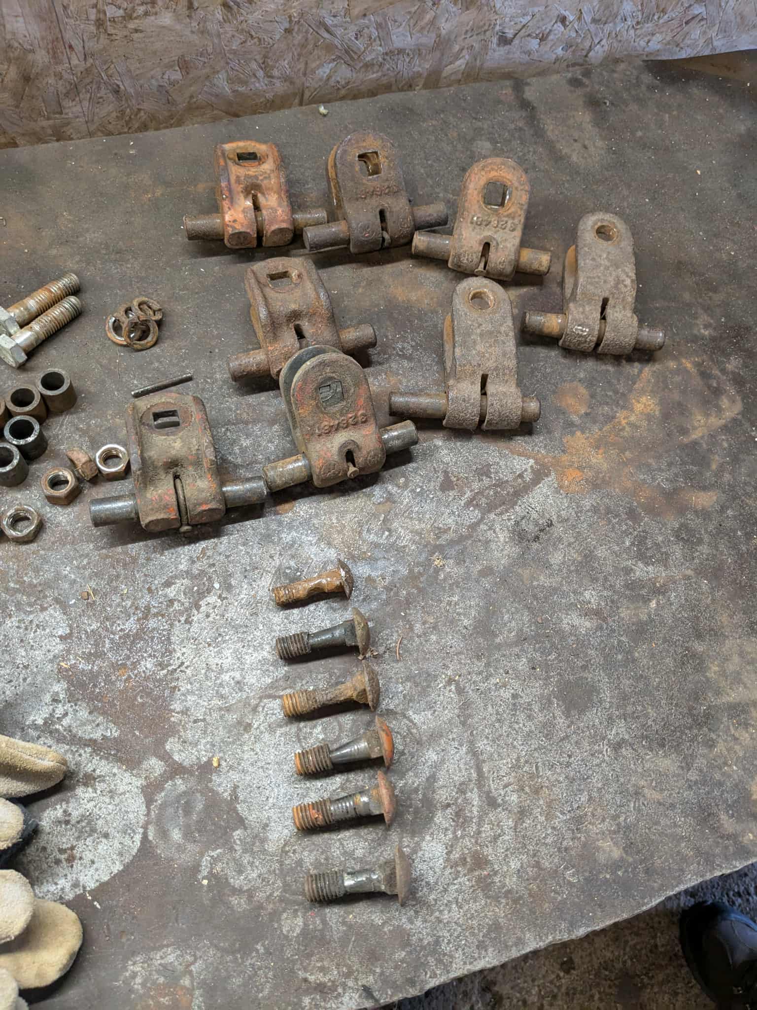 I took a couple of lift hooks off one of my snap coupler plows. Good thing I did - not much left of some of those bolts! I decided to take all my other ones off to check as well. They are all getting replaced. I would hate to see if one of those bolts failed while going down the road. Also switched out the bent over nails in the pins for proper roll pins. ![]() ![]() |