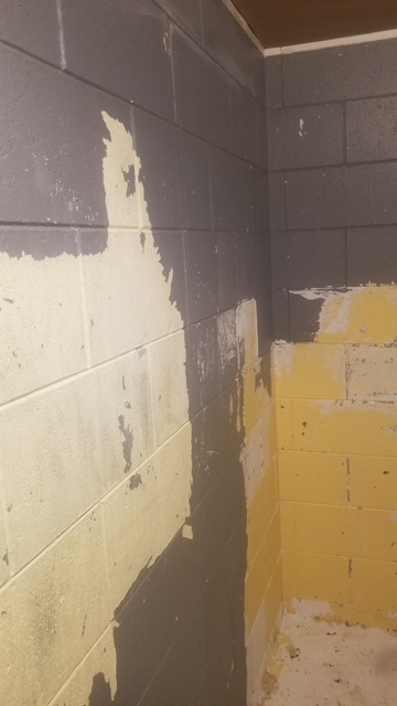 This area was painted/coated with something that paint strippers won't touch. Three different stripper types were tried as per label directions concerning coverage, and dwell time. The gray lifted fairly easily, the white with great effort and multiple applications, the yellow, not a chance. In the photos, yellow is the base applied to the block; at some point it was repainted white, and then another white coat, then ultimately the gray color which would readily peel if sprayed with hot water in places. I elected to blast the shower area clean using a 20-40 blend of coal slag media. This is a fine grit but aggressive but the hope was to not profile the block terribly to render a smooth and consistent finish. A lot of covering of the toilet, vanity, medicine cabinet and electrical outlets with "Gorilla" tape to ensure a clean parting line when peeled off. The window sash was removed from the opening and an evacuator fan placed into the opening. Process when quite well really and very little dust in the finished basement area to clean up. There was enough room for my small blast pot, and 350# of media and still allow room to work. Starter photos: Job as started after they had expended several hours labor and materials: ![]() ![]() ![]() More following.