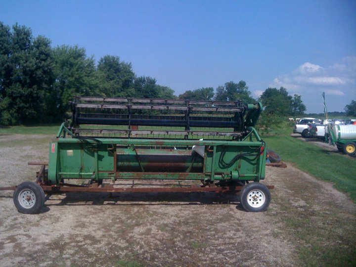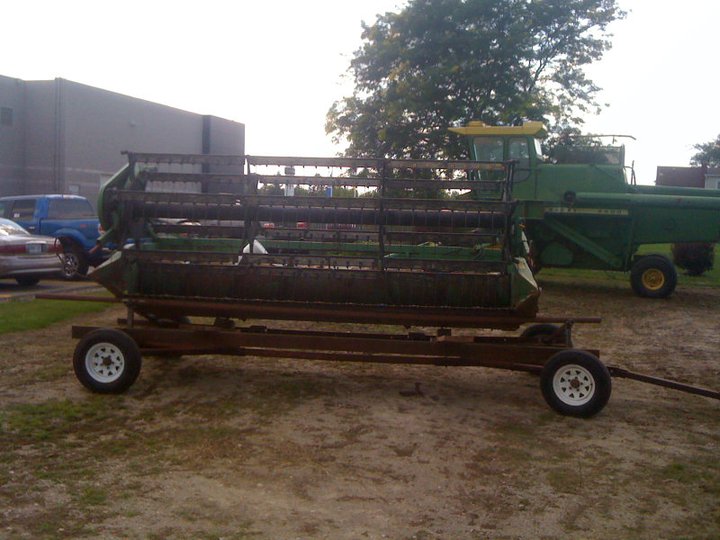 I built one just a few weeks ago out of an old wagon gear.  It had 5 bolt hubs that 13" trailer tire bolted right onto.  That lowered it down just the right amount.  I welded a big piece of angle on one side and made an adjustable pipe frame on the other that folds up under a piece of C channel when I want to set the corn head on it.  When I use it for the grain heads I need to set some wood blocks inside the channel (you can see them sticking out in some of the pics, I cut them off so it doesnt look as stupid) or the feederhouse hits the inside of the channel when I try to back out of it.  My total investment has been 120$.  I had metal lying around and the wagon gear.