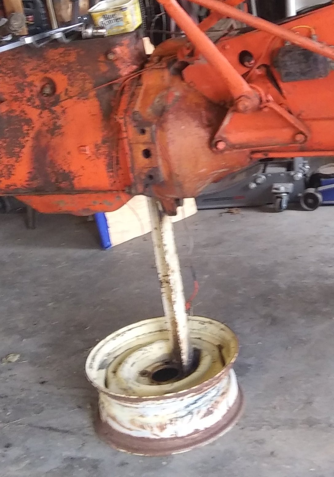 wanting to pull engine from my C and not wanting to use jacks and blocks to hold it up for a while, I spent 15 minutes to fab this stand from an old rim and a piece of 2x2 angle with a 3/4" bolt thru the loupe on bellhousing.