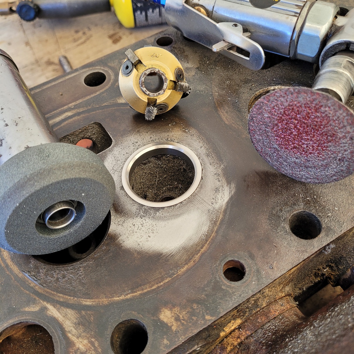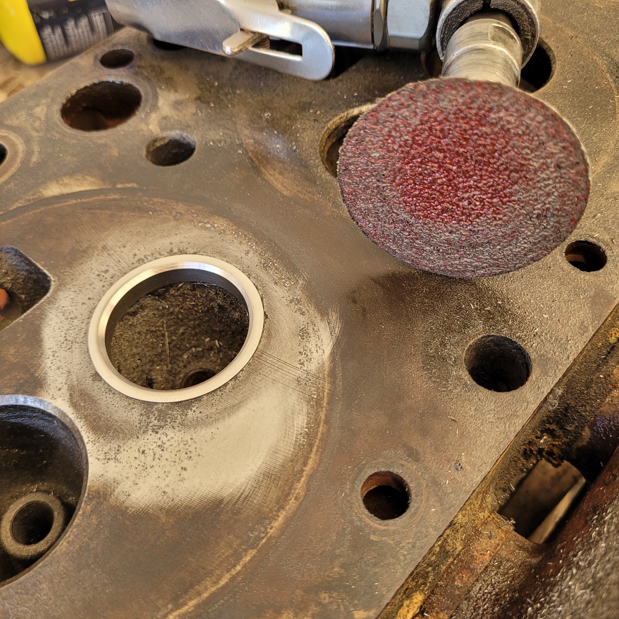 I had to take about an 1/8" off the top once I got the seat in. With the seat froze in the freezer and the head at outside Temps the clearance was .015 took a couple taps to get it in. The stone was going to slow. To get the material off faster I used a 40 grit sanding pad, then the fine stone to true it back up and then cut the sealing face in. Still might stake it in. I did leave it sticking up off the surface of the head about .020 figured that would be ok. ![]() ![]()