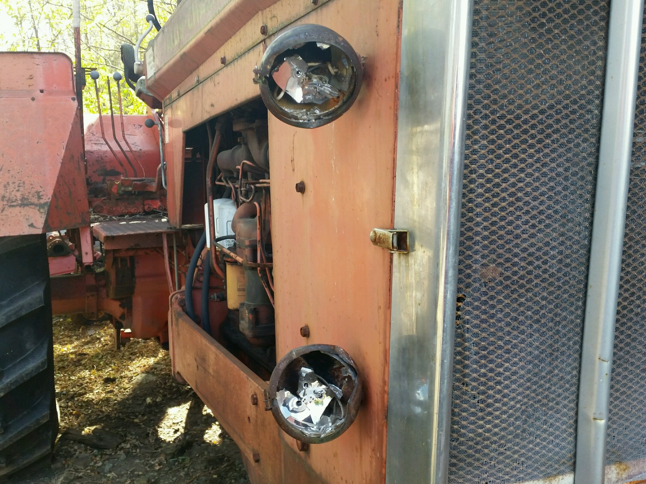 A small update on the D21 situation. I never thought to look up when inspecting everything before, but they also got the pre-cleaner bowl assembly on the tractor. They also very, very slightly brushed the side of the chrome grill when they knocked out one of the headlights. It's extremely minor and I don't think I could prove they were responsible. It's almost impossible to see the damage and it would be taken care of when I redo the grill someday anyhow. I might just get all new re-pro lights from Steiner, but I would still be interested to know if anyone has some nice originals. Still a big mess to clean up here... lots of busted cab glass, mirror glass, signal lenses, etc... It's brought our service business to a standstill, because we can't move anything until the insurance adjuster comes and most of the shop work we had lined up we can't do because the customers tractors ready to go into the shop were the ones vandalized. What's more is that we had one new tractor damaged and four used tractors are now damaged and I can't sell them during end of year business Censored